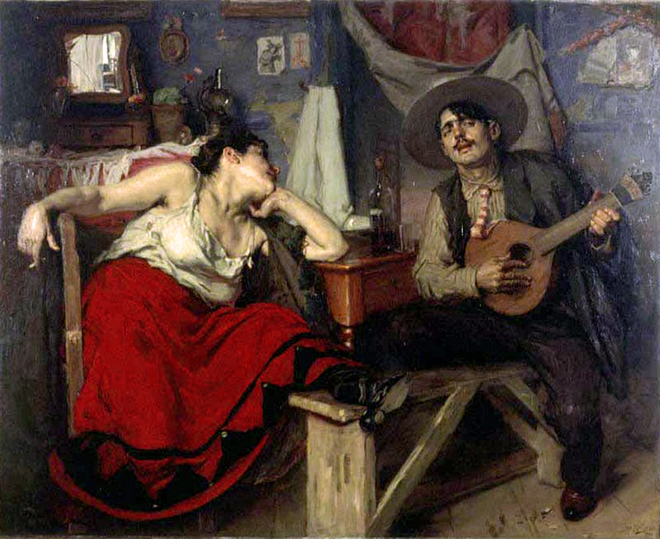 (José Malhoa, Fado, 1910, Óleo s/ tela, Dim. 1525mm x 1855mm, localização: temporariamente em exposição no Museu do Fado, Nº de Inventário:MC.PIN.1. Fonte: www.museudacidade.ot)